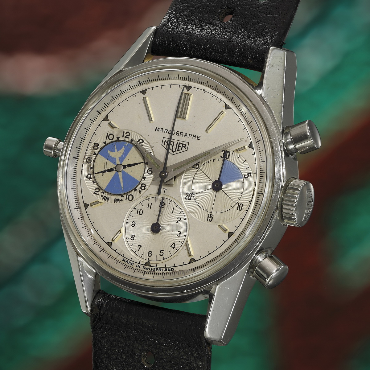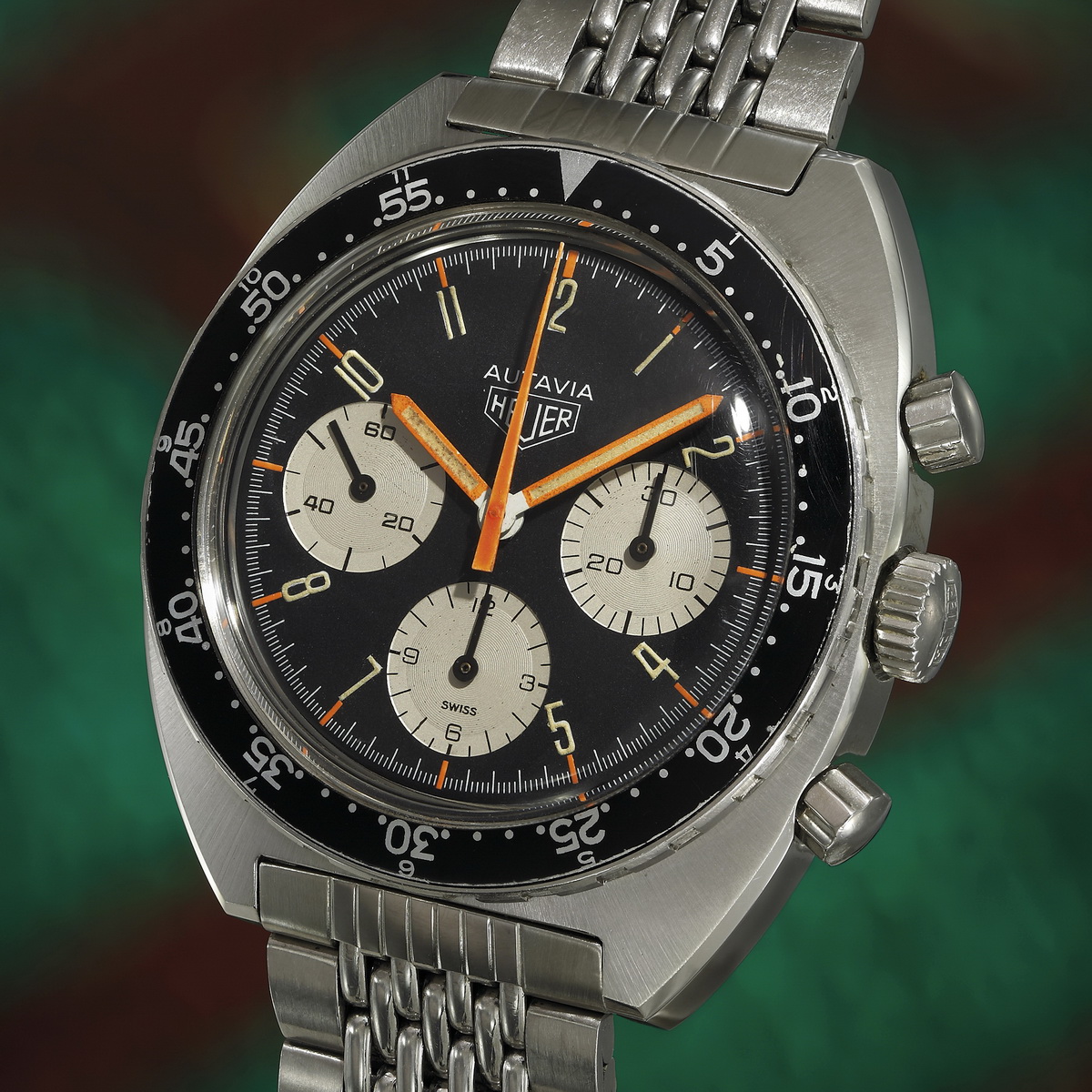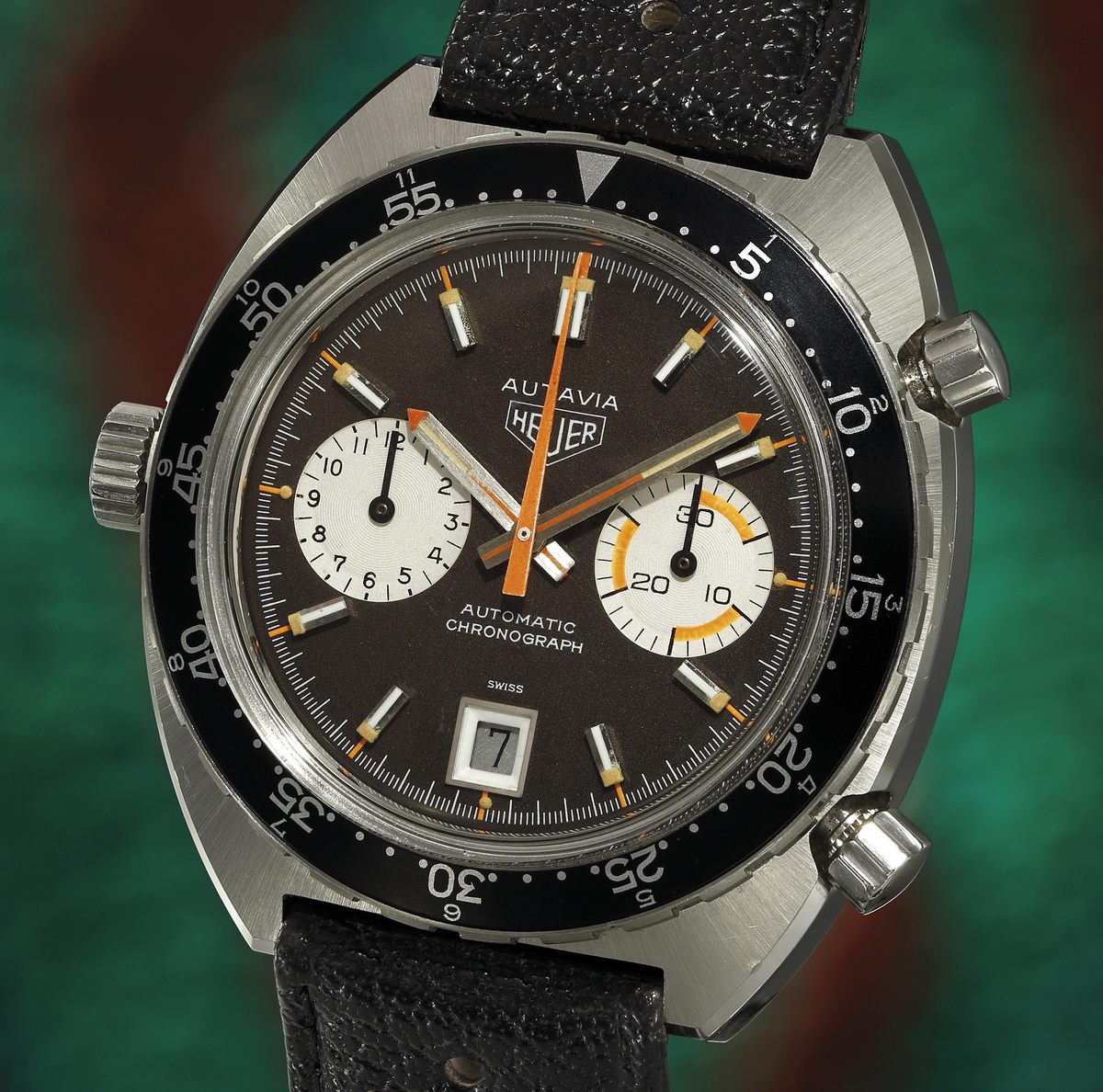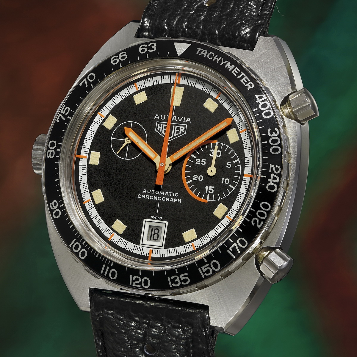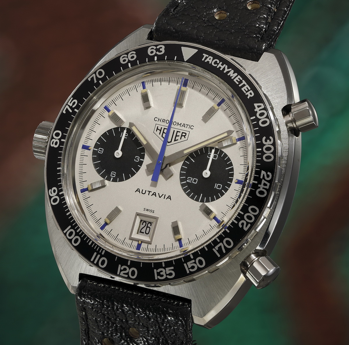 Phillips is presenting this auction as the “Heuer Parade”, and has produced a magnificent printed catalog with full details and photographs of the watches. This printed catalog is presented in seven chapters, each of which presents a different aspect of Heuer’s history (for example, motor sports, race timing and military-issued watches).